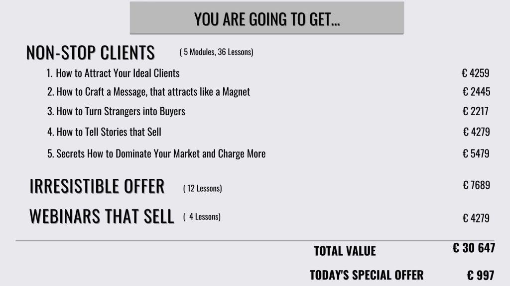 You’ll master to craft Irresistible Offers, write a message that makes them beg for your products, and so much more…